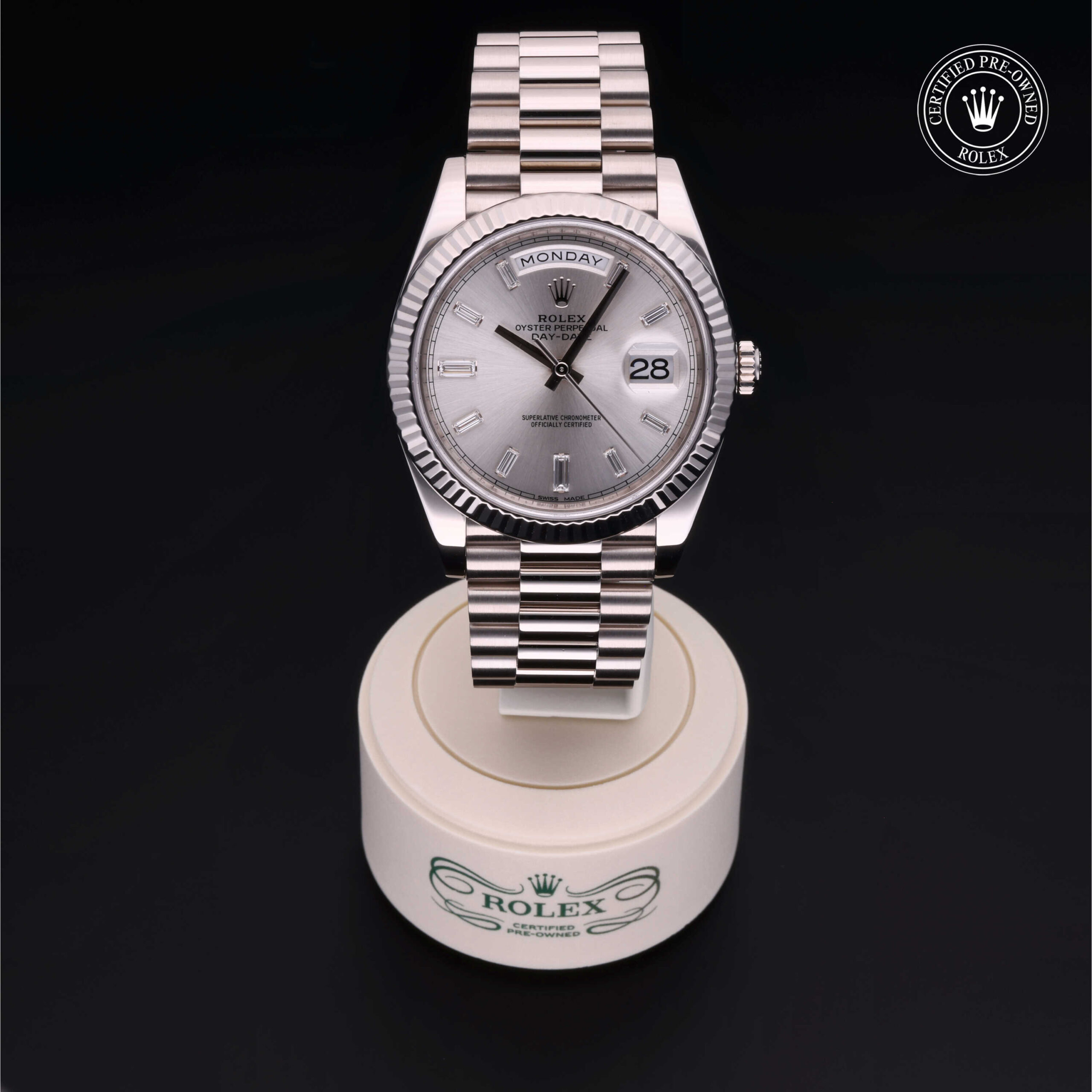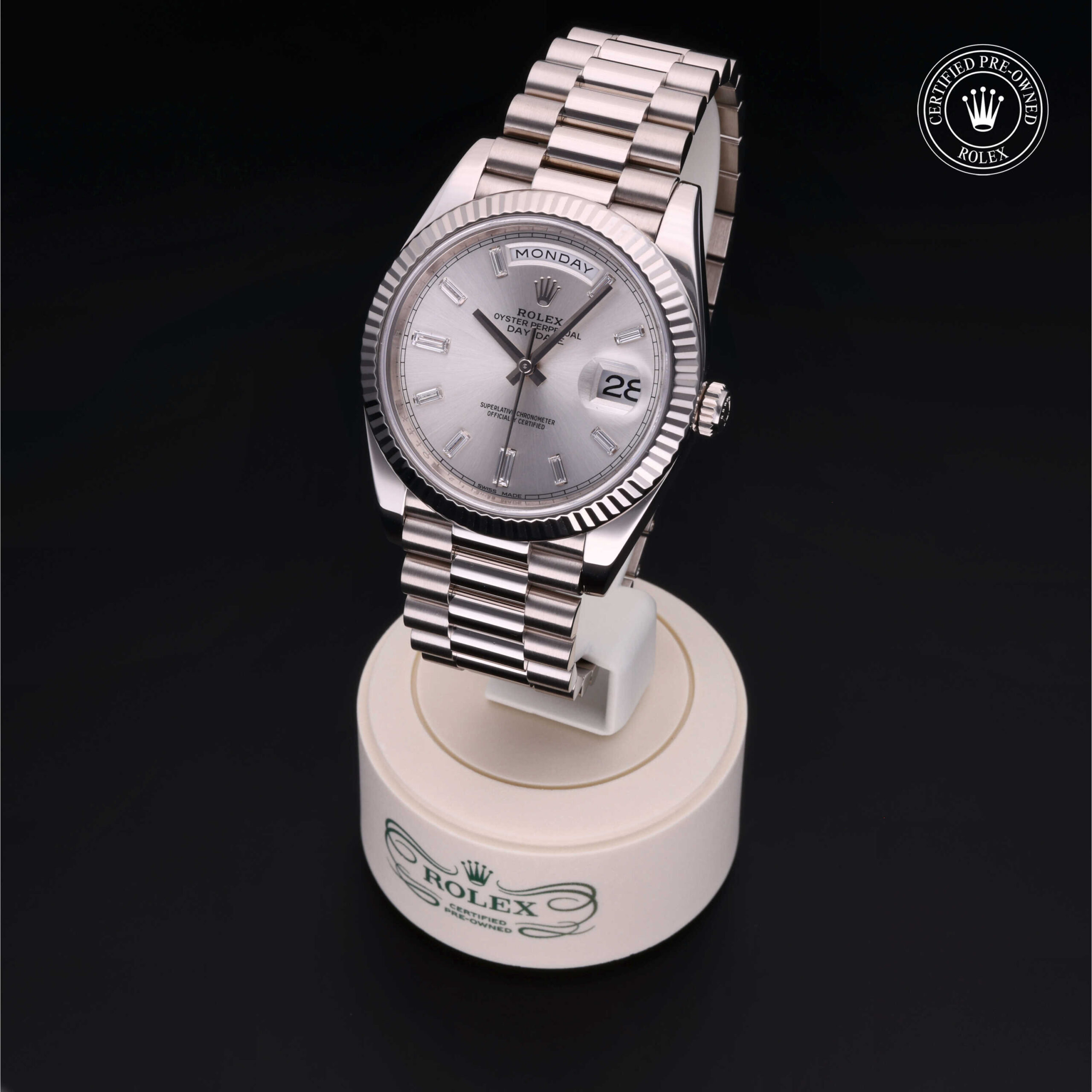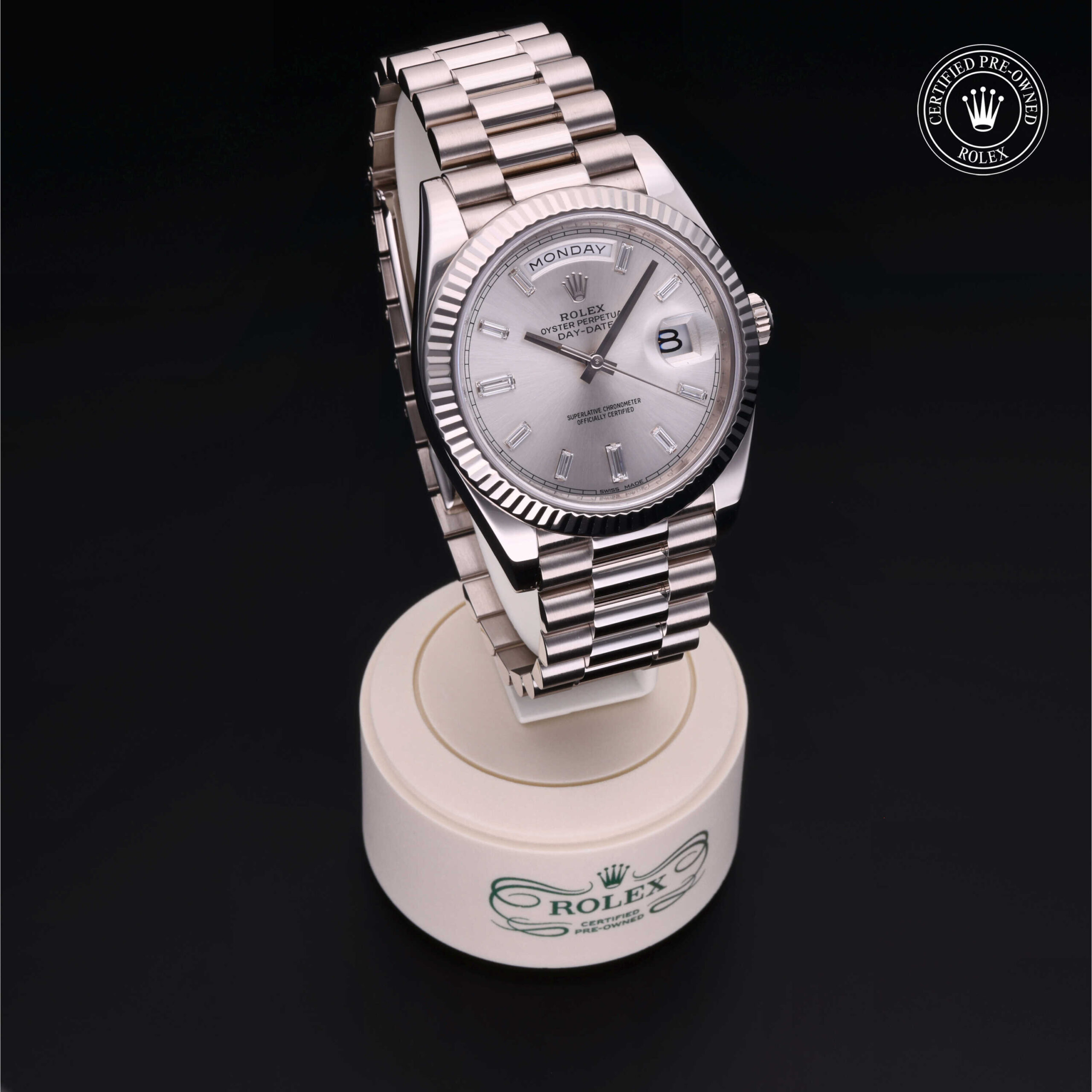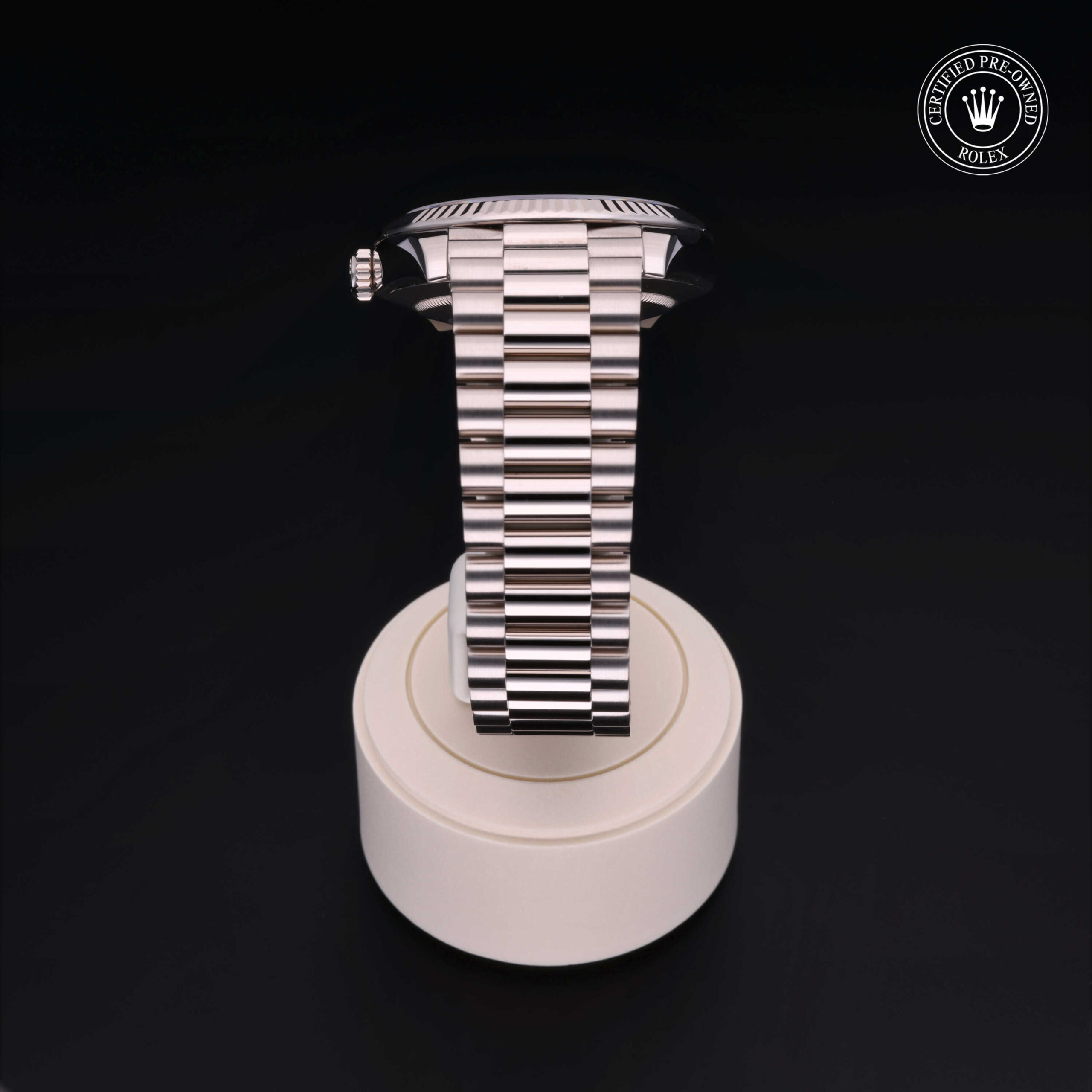 The Oyster Perpetual Day-Date, available only in 18 kt gold or 950 platinum, embodies the essence of Rolex prestige and excellence. At its launch in 1956, it was the world’s first calendar wristwatch to indicate, in addition to the date, the day of the week spelled out in full in a window on the dial – a major watchmaking innovation.